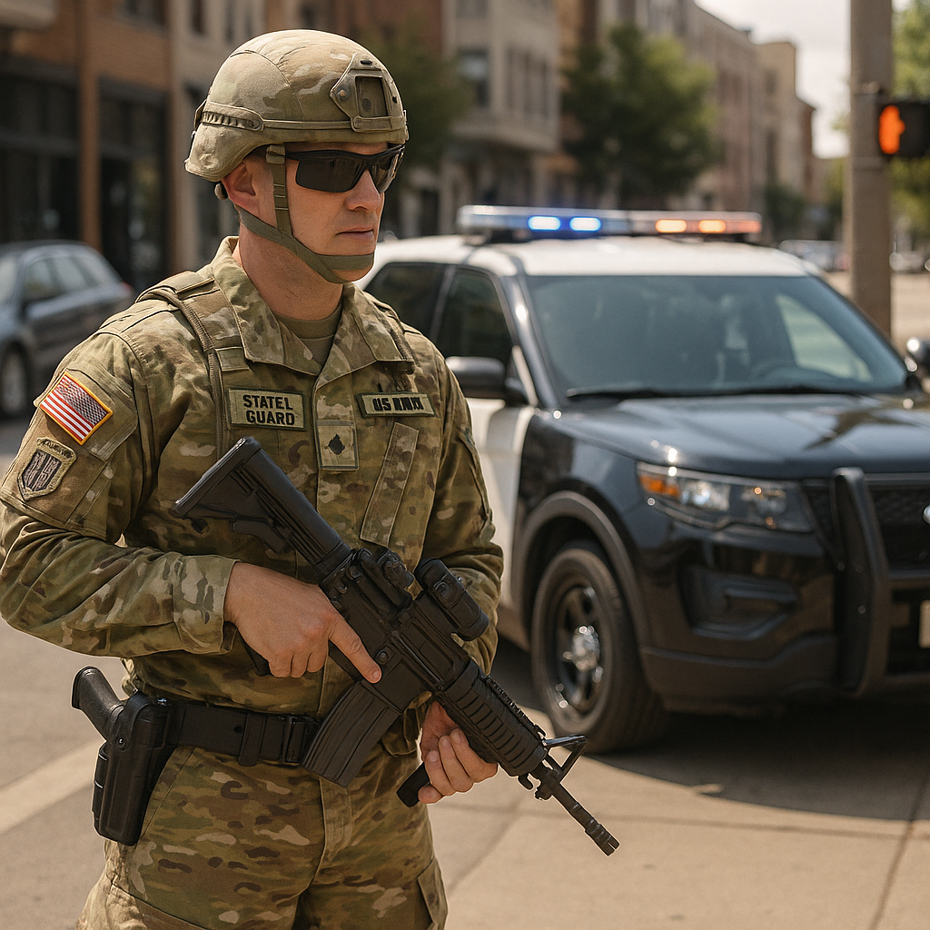 “The National Guard is now THE LAW. Better, faster, STRONGER. We’re bringing JUSTICE to the streets — and maybe your sidewalk!”